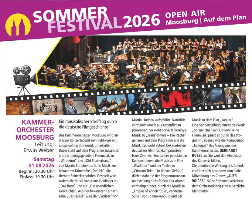 ACHTUNG: Bei schlechtem Wetter ziehen wir um in die Stadthalle Moosburg ! Informationen dazu finden Sie 2 Tage vor der Veranstaltung unter www.kultur-moosburg.de